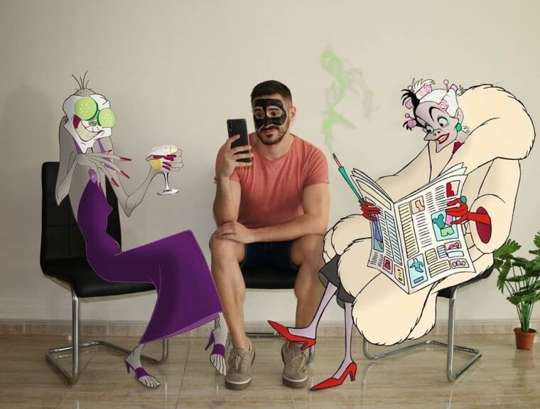 We’re not too surprised that Yzma and Cruella De Ville get along. Yzma is enjoying a facial treatment while Cruella has rollers in her hair. The three will look fresh and styled on their way to be extra evil.