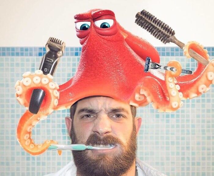 Luigi is late for work and needs to get ready as fast as possible. Hank has the razor, trimmer, hairbrush, adn toothbrush ready to work. He doesn’t look too happy to have the octopus on his head but what would he do without him?