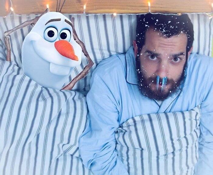 Olaf likes warm hugs, but he needs the temperatures to be cold for him to survive. That means poor Luigi is subjected to a very cold night on their sleepover. Olaf looks happy as can be, though. But that’s his usual state.