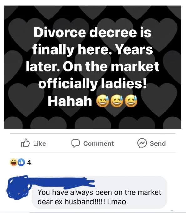 That is unless you were already looking for a new special person long before your divorce took place. This toxic ex publicly announced on his Facebook page that his divorce was finalized and he was officially on the market again. But his ex wasn’t going to let him get away with a bald-faced lie! She reminded him that he had always been on the market, implying the cause of the divorce… That’s shade.
