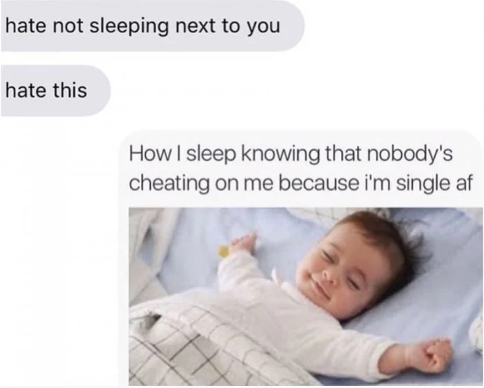 Some tricks are proven to help you sleep at night, whether it’s a good morning workout, cuddling up with your favorite book, or enjoying a glass of wine. But nothing beats a clean conscience. When you’re single and have no relationship drama to keep you up at night you’ll fall asleep faster than a baby who’s had a warm bottle.
