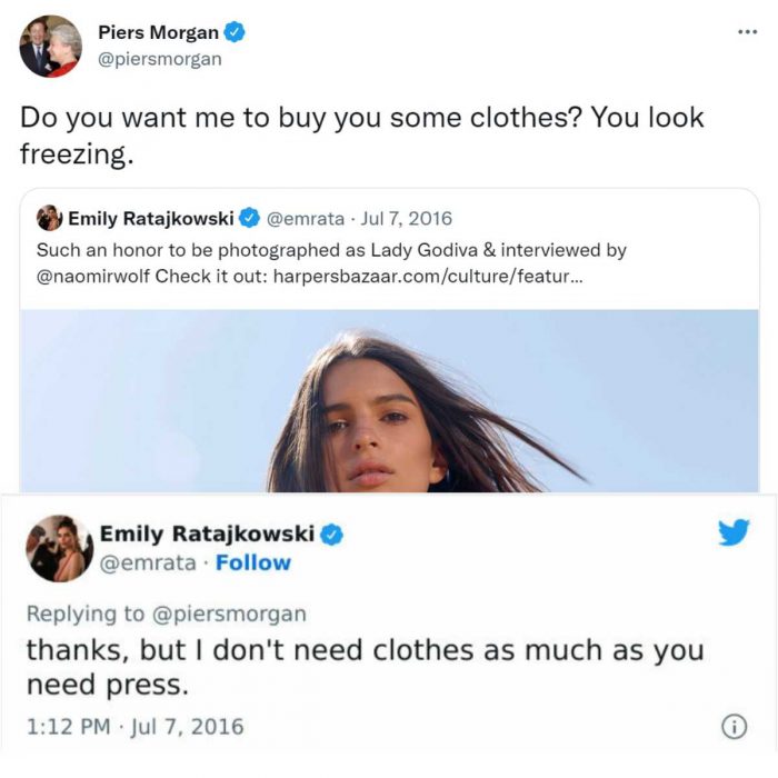 This photo is revealing, but Emily did say she was portraying Lady Godiva, making nudity the whole point. Piers Morgan called out the photo with what he presumably thought was a witty quip about her ability to withstand the weather. The Polish-Israeli model clapped back saying Morgan was fishing for attention more than her. Even if ratings on his new podcast are okay, the fact he’s trolling on Twitter to get viewers doesn’t bode well for his career.
