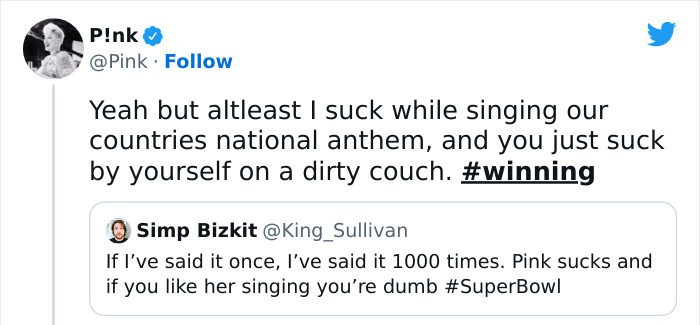 We all have different music tastes, and may not be a fan of every singer out there. But voicing these trivial criticisms on social media seldomly warrants a response from the star we’re talking about! One commentator criticized P!nk’s rendition of the national anthem at the Superbowl. It’s much harder to sing in front of thousands than to sit, tweet, and tear the performance apart.