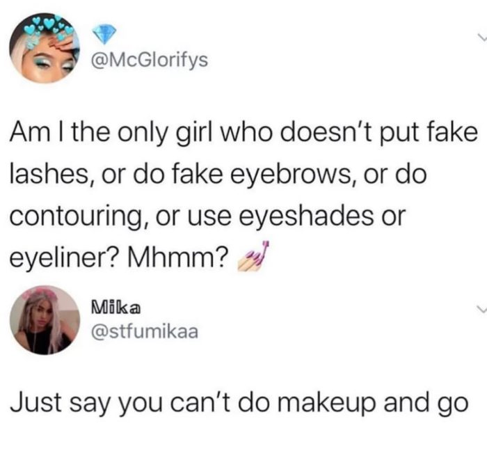 The hilariously ironic part here is that in her profile picture, this girl is clearly using some crazy eyeshadow and eyeliner. So, maybe she doesn’t know how to do it herself, but she’s paying someone to do it and then turning around and pretending she doesn’t. So lame.