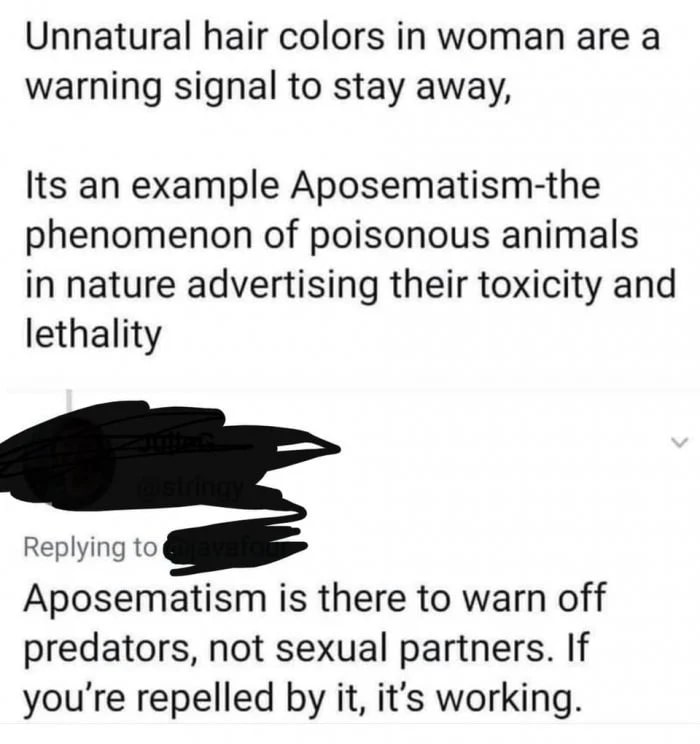 For starters, women’s hair doesn’t naturally change color. Sounds like this guy isn’t a fan of dyed hair, and there’s nothing wrong with that. But did he really need to come up with some pseudo-science to explain why it’s ‘wrong’ to color your hair? You’re not convincing anybody, dude.