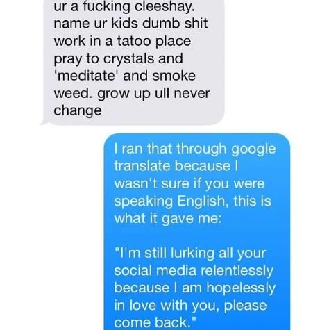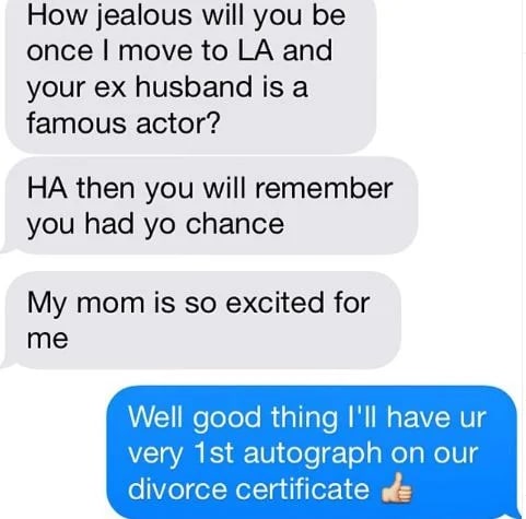 Ah, the classic “You’ll regret what you could’ve had” move. This can be very effective if the person in question is successful, happy, and talented. But when your ex is a wannabe actor whose biggest supporter is his mom, your only regret is that he still has your phone number. We know for a fact this guy is in his mid-30s, still lives with his mom, and doesn’t know that LA is short for Los Angeles.