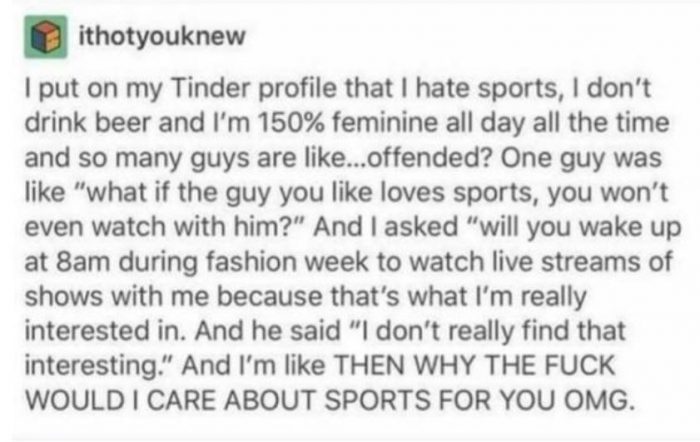 What we don’t understand is why someone would get offended by their partner having different hobbies. This man has a total double standard when it comes to his girlfriend enjoying things he isn’t into. We wish him luck finding anyone who agrees, something tells us he won’t be very successful.