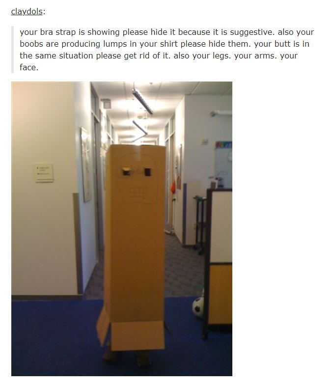 The truth is no matter what women wear, someone will have a problem with their choices. Who knew shoulders were so seductive? At this point, we should make it a trend to respond to strict dress codes with obnoxious boxes or tarps. We think that would prove a point to the haters out there.