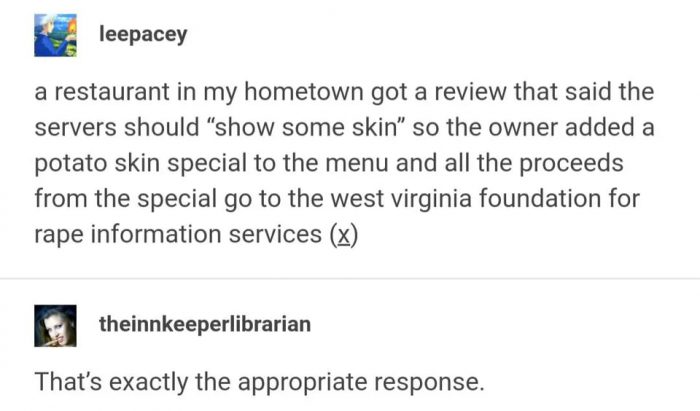 This woman did what any brave woman would, she used humor to thwart this unwanted advance. It was clear enough from the beginning that she wasn’t interested, so this odd form of rejection only seems fair. What’s your go-to when you get questions like these? These bizarre and funny responses might be good to try!