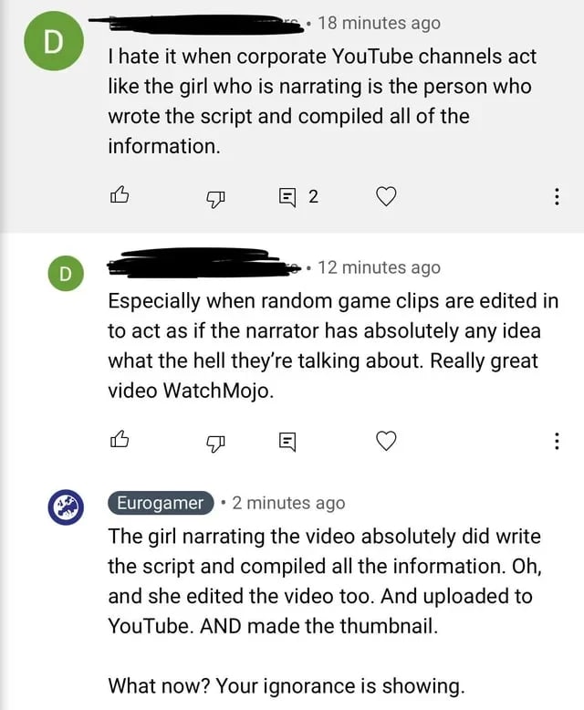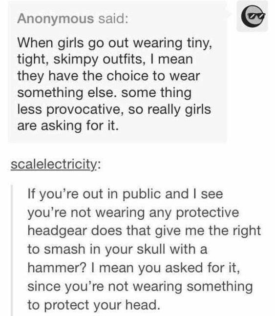 It’s a shame she had to spell it out for this person in the first place. By their logic, they might have to wear protective gear from here on out. Additionally, they should probably just stop walking around with their wallet, as clearly that’s them asking to get mugged. It’s just common sense, right?