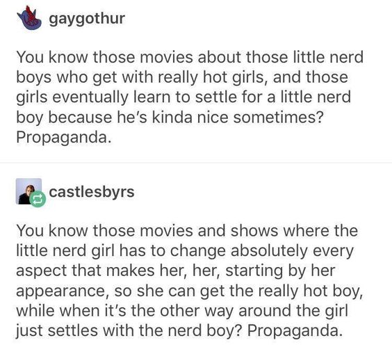 Movie tropes are often overused, but people still seem to like them. It feels like the same exact movie gets churned out year after year with a small twist. The dynamic between nerds and jocks is loved by people around the globe. The movies we watch can indeed influence us, but to call this effect “propaganda” seems a bit much.