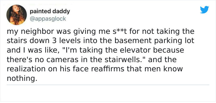 There are a lot of things women are cautious of. The sad reality is that women need to be much more aware of their safety, even during their daily routine. This means not going places alone, walking in well-lit areas, and parking close to entrances. This is a universal experience for most women, yet one that is still hard for some people to grasp.