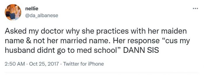 This doctor has the right idea. She’s the one who put in all the work (not her husband), so why should it matter if she wants to keep her maiden name? We’re not sure where or what she practices, but we’d love to go to her for medical help regardless!