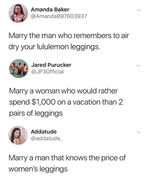 Any woman would be lucky to find a man who knew that Lululemon leggings need to be air dried. Leave it to Jared to get offended by this tweet, and then out himself for not knowing the price of basic items. Some people just don’t know how to take a joke.