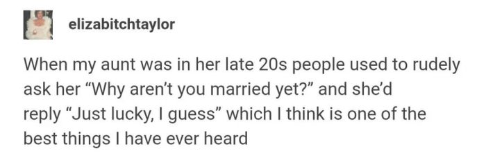 There’s definitely a polite way to ask about people’s relationship status, and this wasn’t it. No one wants to feel judged for their choices, especially by family. This person could have explained all the (valid) reasons for not getting married, but this response was much funnier. Maybe this will keep her family members out of her business.
