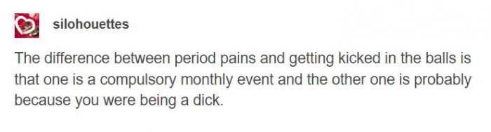 The difference is that periods aren’t exactly preventable, they happen once a month whether you like it or not. If you’re hanging around people who might knee you in the crotch, it may be time to seek out different company. Next time a man tries arguing this, suggest he sign up for a period pain simulator.