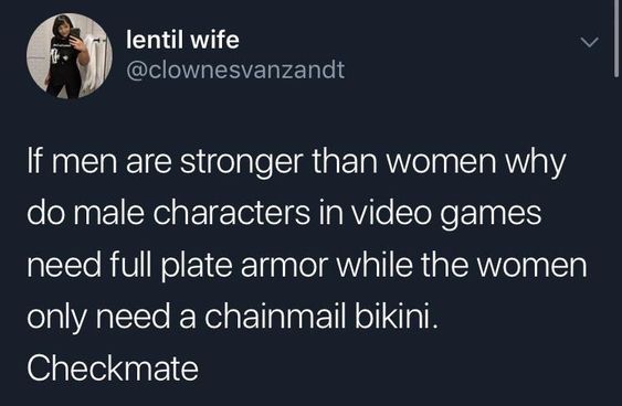 If men are so courageous, why do their virtual outfits require so much armor while women wear practically nothing? The next time your boyfriend picks a fight with you about how much stronger he is, show him this tweet and see what he has to say for himself. Maybe he’ll start playing with the chainmail bikini character from now on!