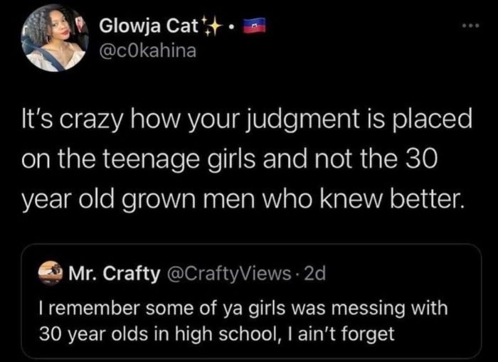When someone thought that shaming teenage girls for dating 30-year-old guys was cool, this woman shut him down by stating the obvious. The ones that should be shamed are the thirty-year-old men who preyed on barely legal teens. She did the world a favor by reminding him that grown men should know better.
