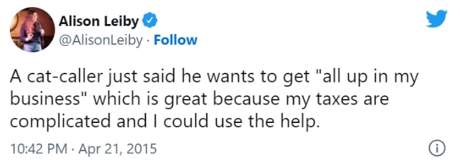 She decided to take his words at face value and asked for business advice, explaining that her taxes were a real pain in the behind and that she’d appreciate the help. No one likes taxes, so we’re sure he bolted after hearing that. Catcallers aren’t used to being talked back to, and we’re sure he wasn’t expecting such a clever comeback.
