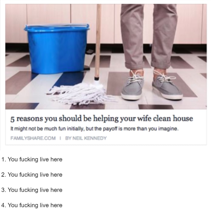 This article shared five reasons why men should help their wives around the house, claiming that, although cleaning isn’t fun, it pays off. But people weren’t having it and used the comments to remind the world that there is one reason and one reason only for men to do their part in the household chores – because they freaking live there, too!