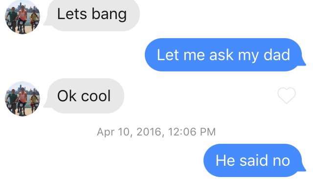 This courteous gentleman tried his best to bravely win this lovely lady’s heart by eloquently declaring, “Let’s Bang.” Instead of calling him out for being a pig directly, she chose to take the comedic route and told him she needed to ask for permission from her father. Her highly intelligent suitor took the bait and genuinely believed her.