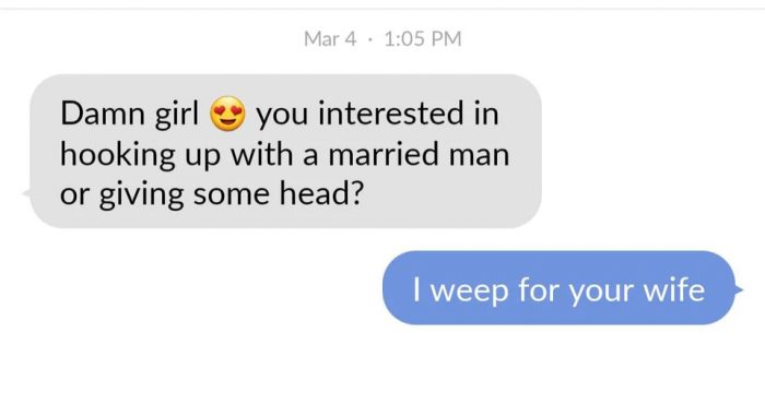 When dealing with a cheater you have to thwart their unwanted advances as quickly as possible. This person didn’t feed into the conversation at all, not even a simple greeting. They immediately went into questioning mode. You’d think after he got called out for being married he would have retreated, but he just had to go and dig himself a deeper hole.