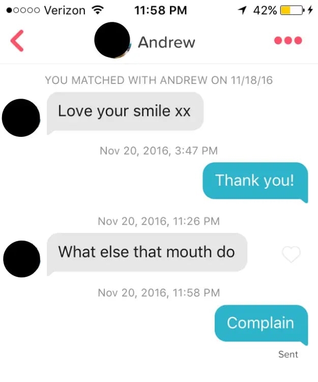 This exchange may start out innocently, but don’t be fooled by flattery on dating apps. This dude thought that if he complimented his match’s smile, she’d be more likely to go along with his next comment. But instead of telling him what he obviously wanted to hear, she one-upped him.