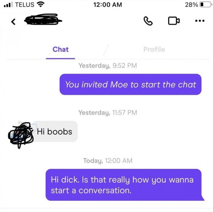 This isn’t how you say hello to someone. Unless this person’s name happens to be Boobs, don’t open with that word. Try to be a bit more polite and aware of what you’re saying. This may seem like common sense and decent advice to most. That doesn’t mean everyone sees it that way. This Romeo decided to shoot for the stars and see what happens with this carefully written opener.