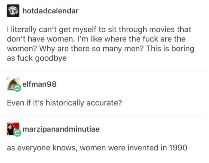 What better way to shut down a person, than with a boat load of sarcasm? It was short, simple, and hilarious. We hope this person is reminded of this comment every time they go to watch a historical film. Maybe directors will wake up and remember that women have existed throughout history!