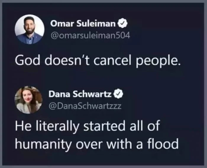 This user shared a Tweet saying that God never cancels people, but many found a loophole in his statement. Someone responded that God literally started all of humanity over, reminding him of Noah’s Ark and the Great Flood. There’s a good point there, and we can also add that God cancels us with the fact that we’re all going to die someday.