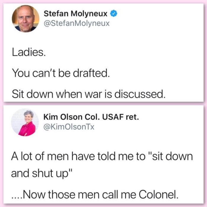 This man was starting a war of his own without even realizing it. You can’t tell an entire gender to sit down without any consequences. His opinions may have landed him in military detention. The road to equality has been tough for women, but Colonel Olson is proving why it’s all worth it. This guy needed a slap in the face to remind him he’s in the twenty-first century, where you can’t say things like that to women and expect silence in return.