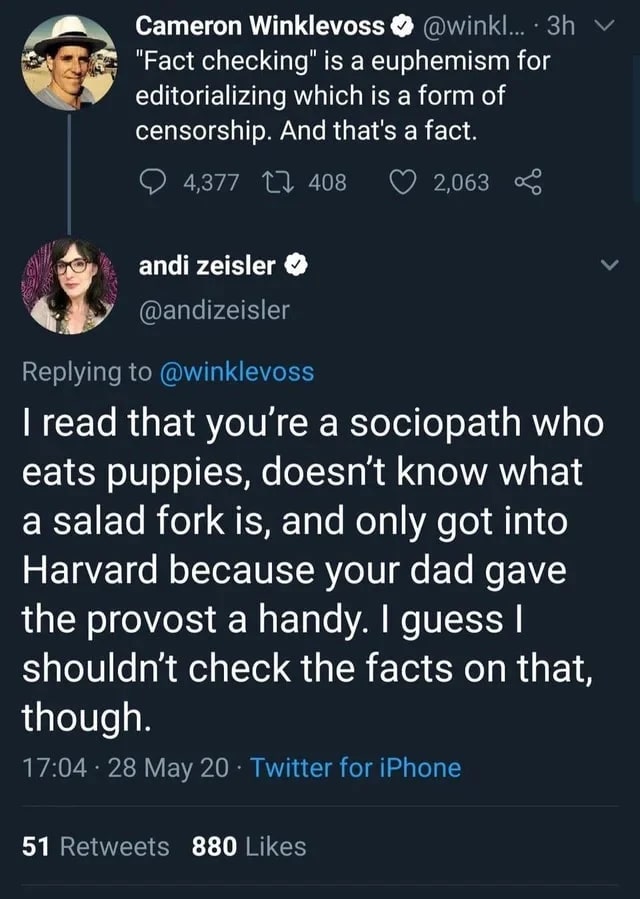 Bitcoin entrepreneur Cameron Winklevoss claims on Twitter that fact-checking is editorializing, which is actually censorship. That’s a big claim. A follower chimed in to tell him what ridiculous things she found about him online. Sometimes things need to get personal for someone to get the point across.